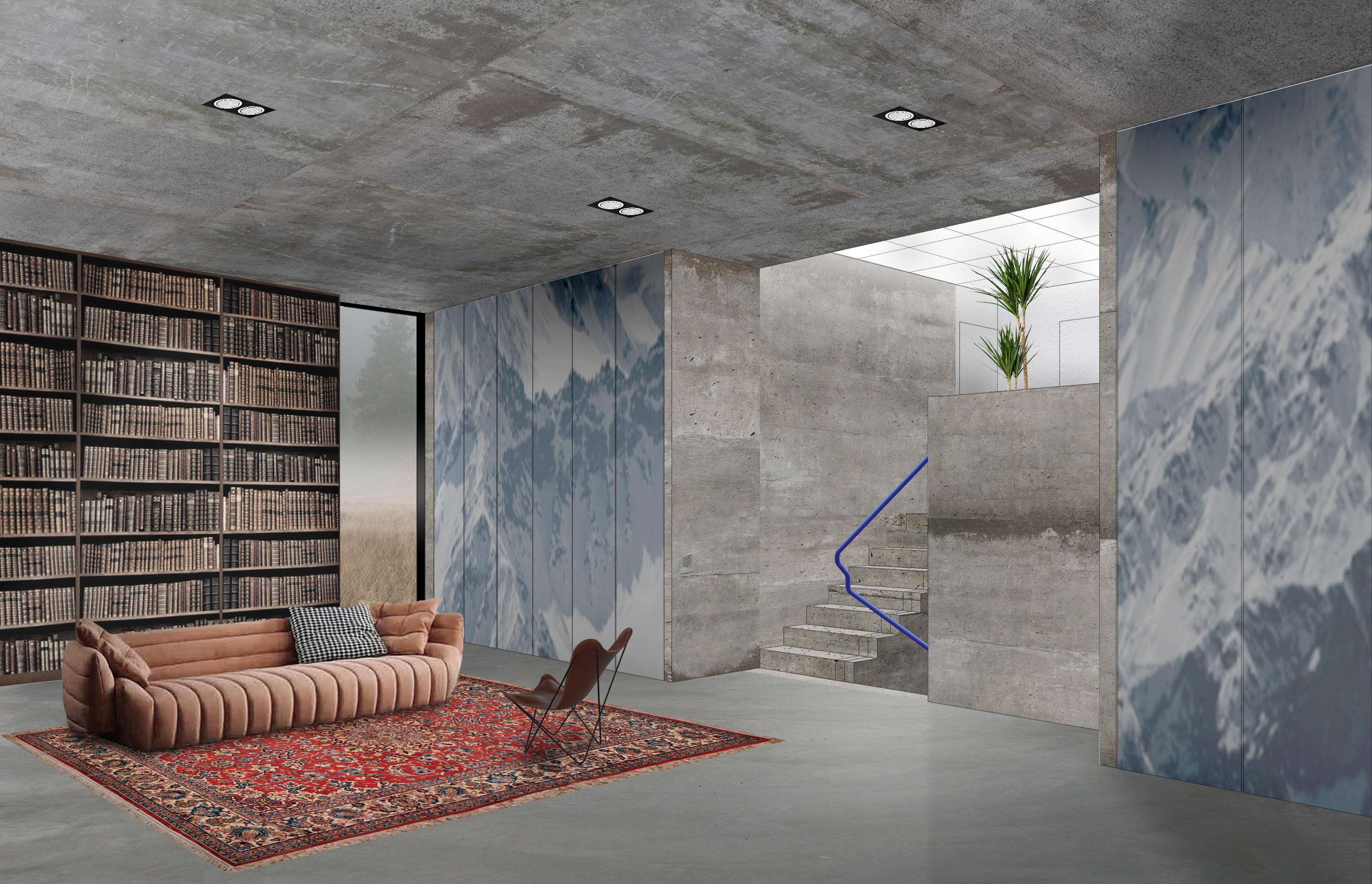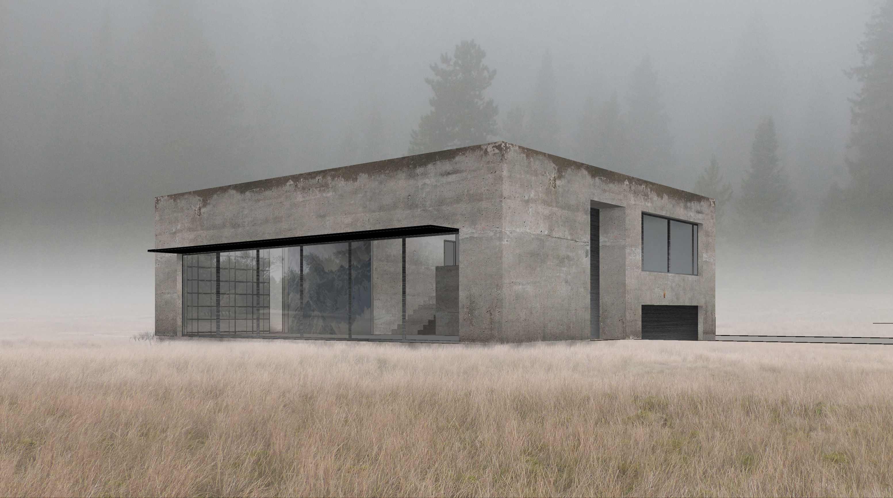 The bunker-like, concrete cubic house, reduced to a more and more compact size during the design process, has a very simple layout: on one side a large living space, on the other a shifted two story part, with bedrooms above and a garage and a boulder room below. In the middle, a skylit central stair and study space connects the functions. The focused structure provides a calm and sober environment, escaping from the everyday life noise.