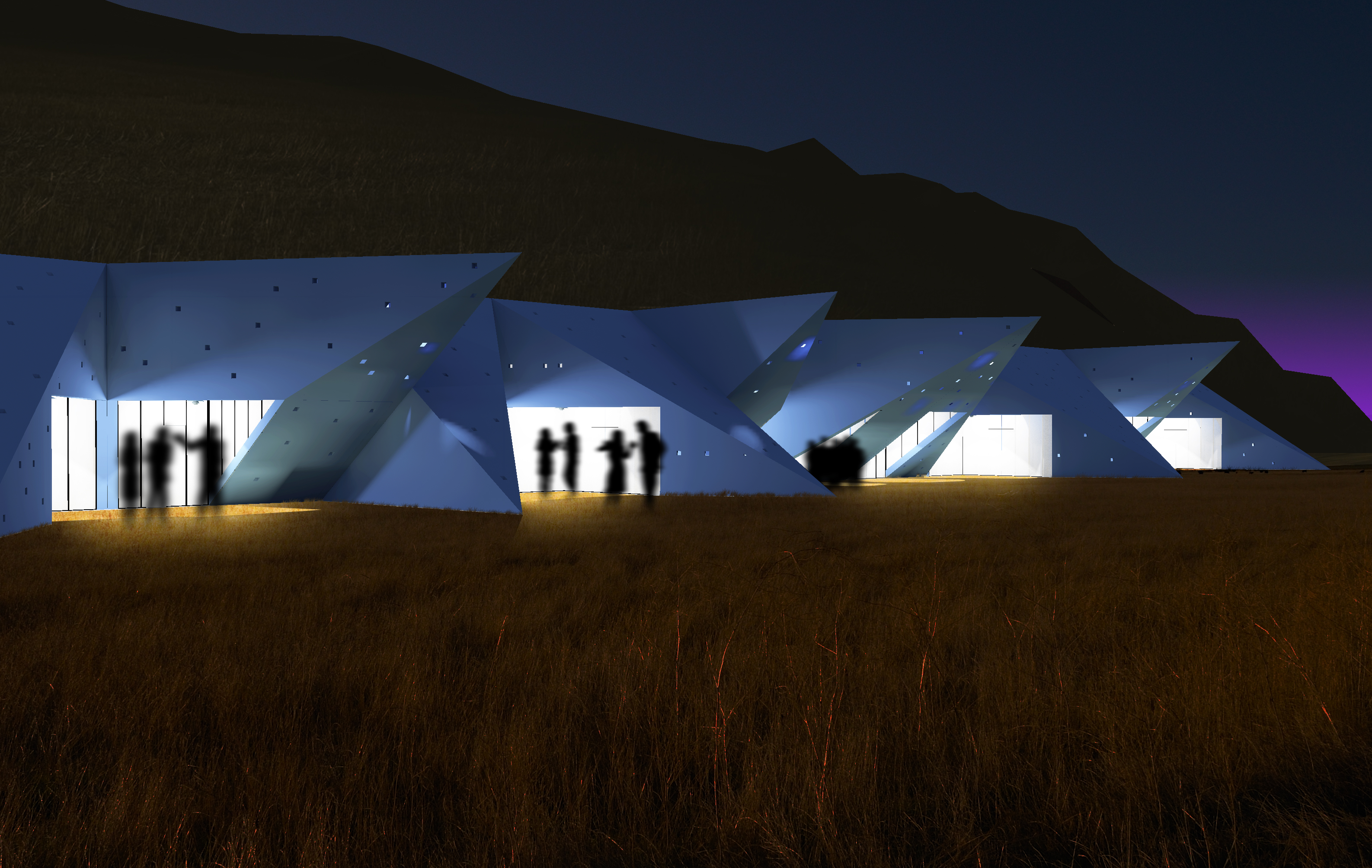 Located between the railway and Tokaj hill, the existing row of cellars require a face-lift, to replace the false folkish entrance fronts. The proposal, created in a 2 week pre-college summer project, features bold geometric architecture of pyramidical shapes in light blue pigmented concrete. The front buildings serve as wine tasting spots and provide accommodation for the owners too.